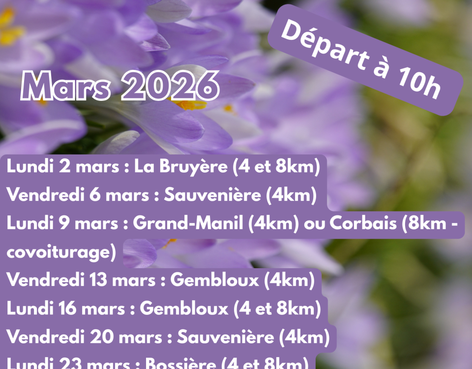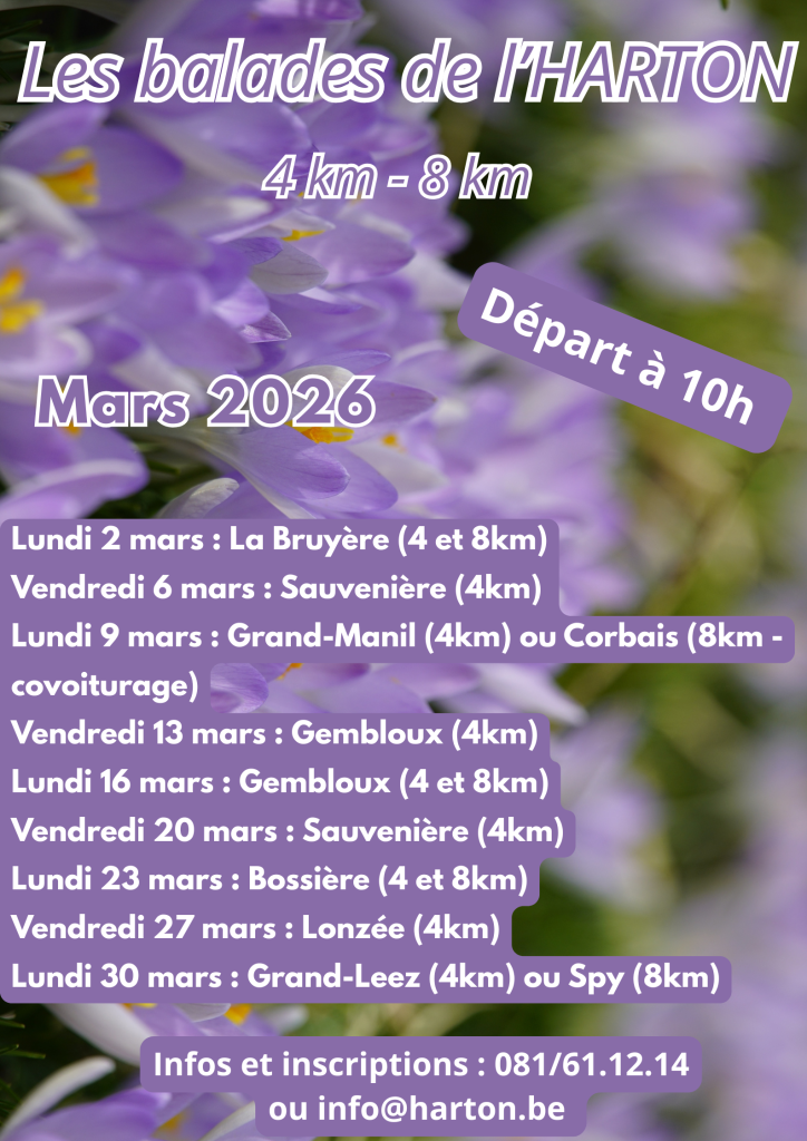 Les prémices printaniers sont là ! C’est l’occasion idéale pour prendre l’air, profiter des paysages et passer un moment convivial ensemble ! Que vous soyez adeptes de petites marches ou amateur.rice de randonnées un peu plus longues , il y en a pour tous les rythmes, nous vous proposons des parcours de 4 et 8km ! En plus de ces balades, Cindy, notre accueillante, vous accompagne tous les vendredis pour une reprise de la marche tout en douceur, < 3km. Bienvenue à toutes et à tous ! Infos et inscriptions au 081/61.12.14 ou info@harton.be