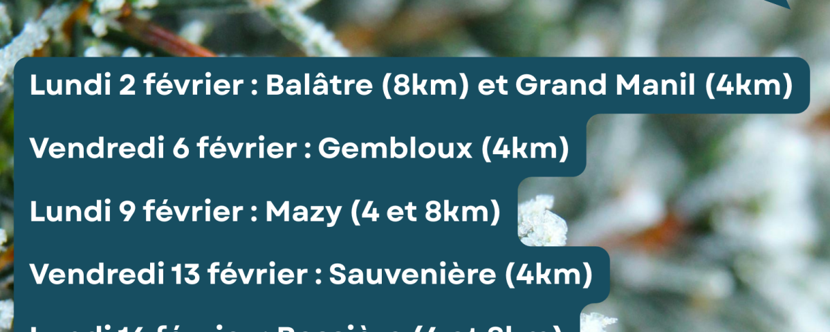 5 février 2026Nous continuons à vous proposer des circuits de 4 et 8km. C’est l’occasion idéale pour prendre l’air, profiter des paysages et passer un moment convivial ensemble !